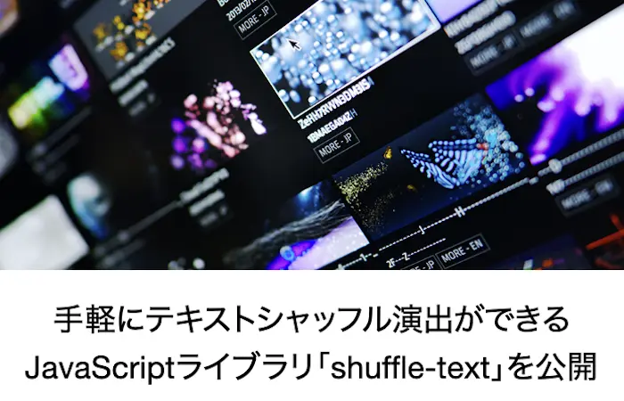 shuffle-textはテキストシャッフル(文字列がランダムで切り替わる演出)の 表現を行うためのライブラリです。 ウェブサイトでマウスが触れたときに演出ができます。 詳細は、こちらをご覧ください。